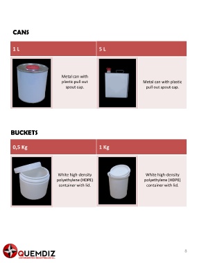 CANS 1 L 5 L Metal can with plastic pull out Metal can with plastic spout cap. pull out spout cap. BUCKETS 0,5 Kg 1 Kg White high-density White high-density polyethylene (HDPE) polyethylene (HDPE) container with lid. container with lid. 8
