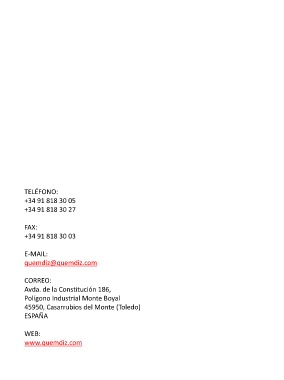 TELÉFONO: +34 91 818 30 05 +34 91 818 30 27 FAX: +34 91 818 30 03 E-MAIL: quemdiz@quemdiz.com CORREO: Avda. de la Constitución 186, Polígono Industrial Monte Boyal 45950, Casarrubios del Monte (Toledo) ESPAÑA WEB: www.quemdiz.com