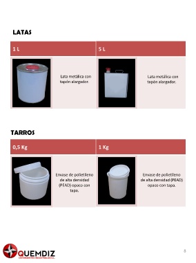 LATAS 1 L 5 L Lata metálica con Lata metálica con tapón alargador. tapón alargador. TARROS 0,5 Kg 1 Kg Envase de polietileno Envase de polietileno de alta densidad de alta densidad (PEAD) (PEAD) opaco con opaco con tapa. tapa. 8